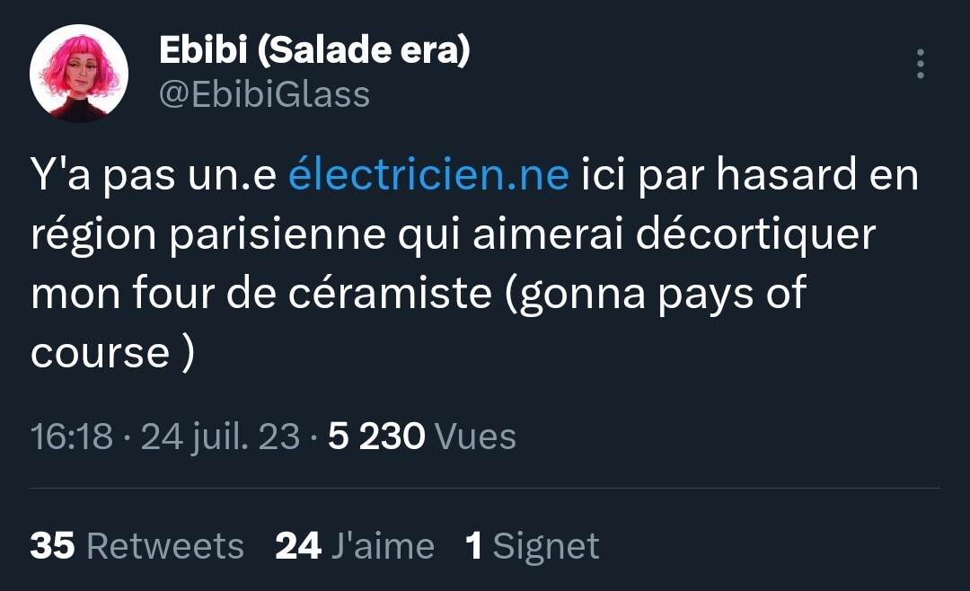 Y'a pas un.e électricien.ne ici par hasard en région parisienne qui aimerai décortiquer mon four de céramiste (gonna pays of course )